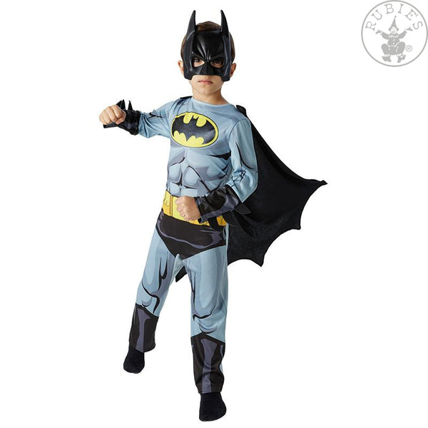An elaborately printed gray overall for children with black sleeve and leg ends. There is also a black cape and a Batman mask.