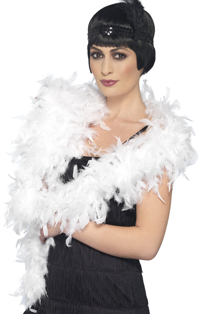Le boa en plumes mesure 1,80 cm de long, pèse 80 grammes et est agréable à porter. Il est disponible en blanc.