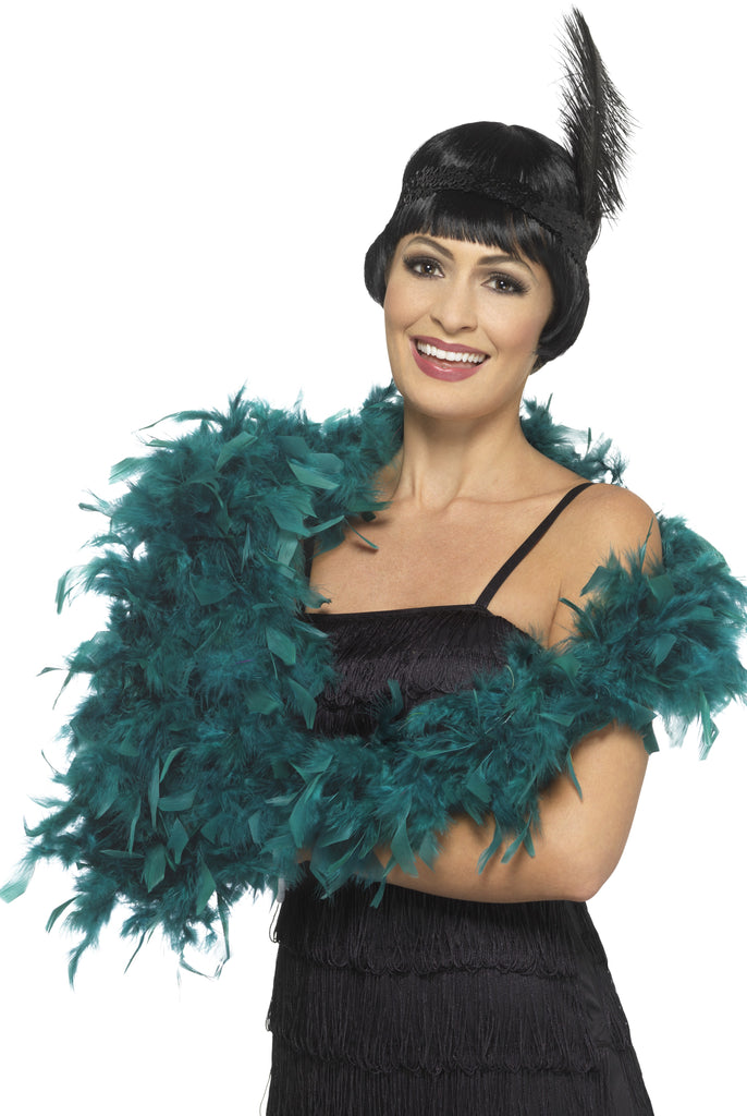 Le boa en plumes mesure 1,80 cm de long, pèse 80 grammes et est agréable à porter. Il est disponible dans la couleur aigue-marine.