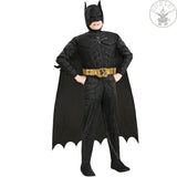 Luxuriöser, schwarzer Batman-Overall, für Kinder, mit muskelbepackter Brust, befestigten Stiefelabdeckungen und Batman-Logo auf der Brust. Dazu gibt es ein schwarzes Cape,eine Kopfbedeckung mit Halbmaske aus Stoff und einen goldfarbenen Gürtel.