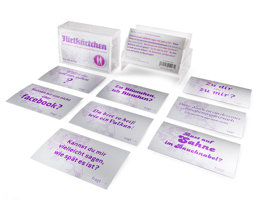 Dir fehlt manchmal der passende Spruch um beim Flirten das Eis zu brechen? Mit diesen Flirt Karten ist das Geschichte! Von zurückhaltend („Kannst du mir vielleicht sagen wie spät es ist?“) bis offensiv („Lust auf Sahne im Bauchnabel?“) ist für jeden der passende Spruch dabei.