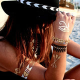 Metallic Body Tattoos sind der perfekte Schmuckersatz an heissen Sommertagen und Festivals! Verwandle deine Haut in ein Gold und Silber Kunstwerk und ergänze dein Outfit mit spirituellen Symbolen. Diese trendigen Flash Tattoos lassen sich mit Bikinis und sommerlichen Kleidern super kombinieren.