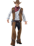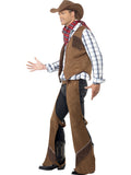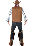Dieses Kostüm kommt mit Weste, Cowboyhose, Halstuch und Hut.